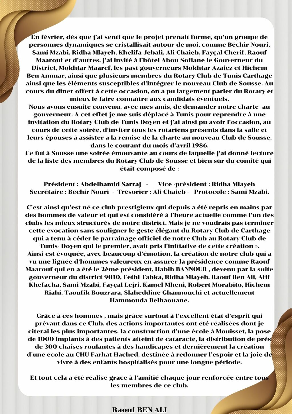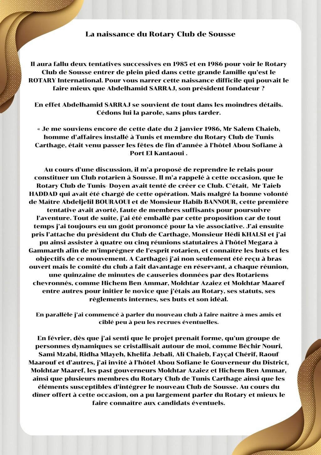 Les membres du Rotary Club de Sousse sont des femmes et des hommes engagés, portés par un profond sens du devoir et de la solidarité. Leur présence active au sein du club témoigne d’un engagement sincère envers les valeurs rotariennes : servir d’abord, dans le respect, l’humilité et la constance. À travers des projets durables et solidaires, ils contribuent à faire rayonner l’esprit du Rotary bien au-delà des frontières